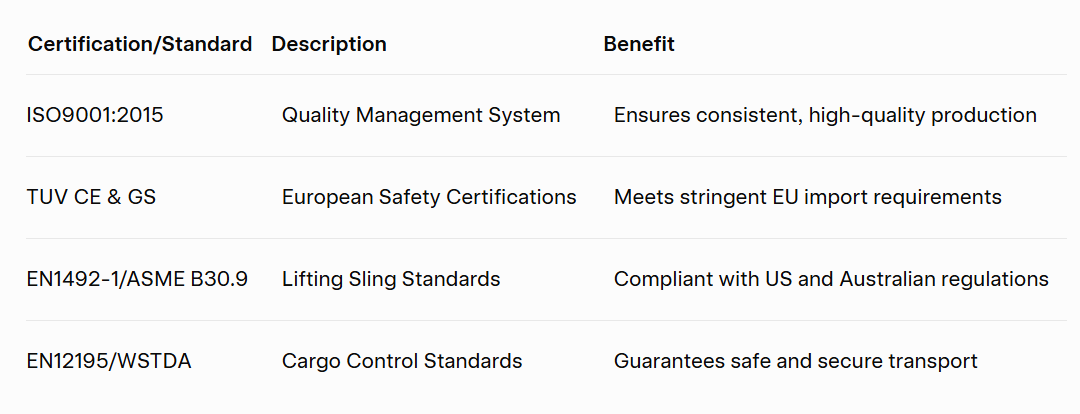 Obtenez un devis personnalisé:Notre équipe répond dans les 24 heures avec des solutions adaptées à votre marché, qu'il s'agisse d'élingues conformes à la norme ASME pour les États-Unis ou d'attaches conformes à la norme EN pour l'Europe.